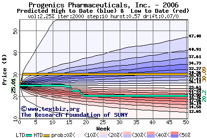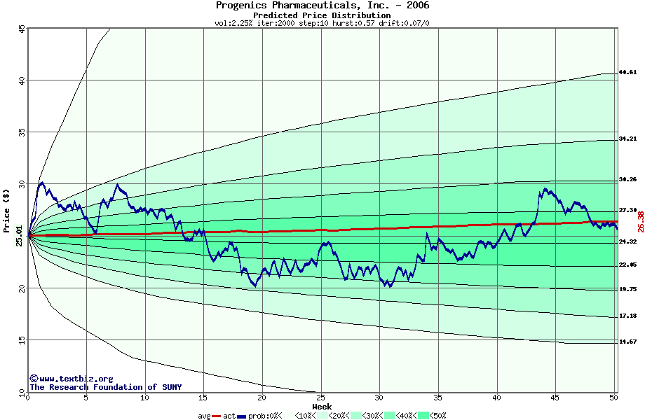 The following graph plots the year-to-date performance of the stock for 2006 compared to the probability calculated by a random walk model.