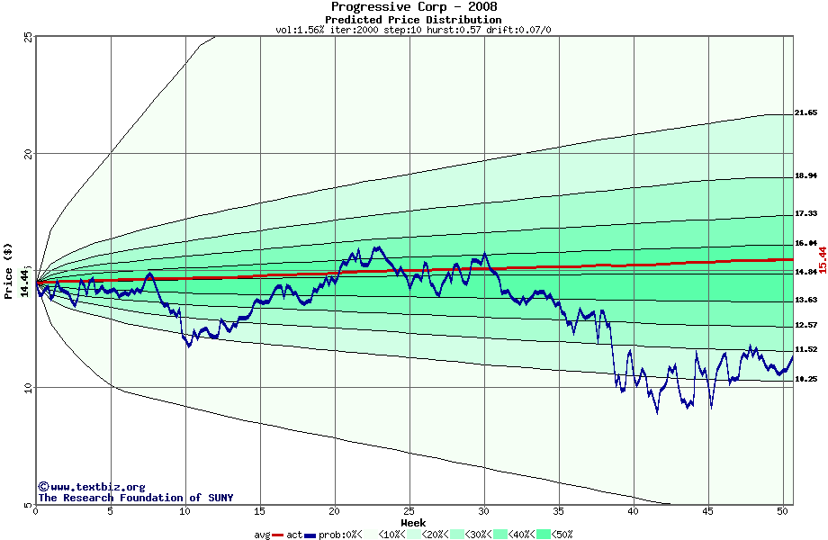 The following graph plots the year-to-date performance of the stock for 2008 compared to the probability calculated by a random walk model.