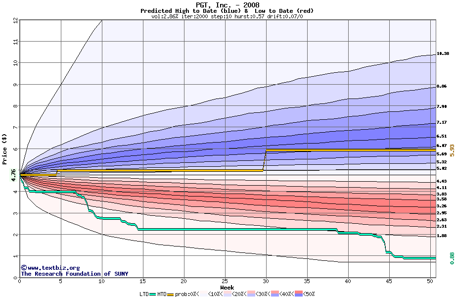 The high to date and low to date prices of the stock plotted against a random walk model for 2008 (what's this?).