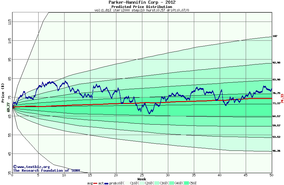 The following graph plots the year-to-date performance of the stock for 2012 compared to the probability calculated by a random walk model.