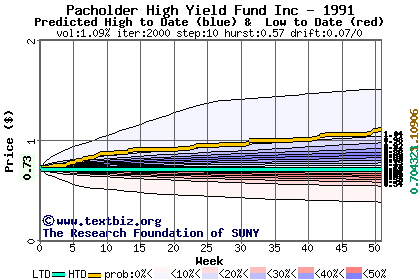 The high to date and low to date prices of the stock plotted against a random walk model for 1991 (what's this?).