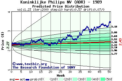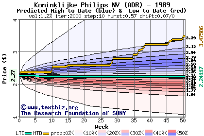 The high to date and low to date prices of the stock plotted against a random walk model for 1989 (what's this?).