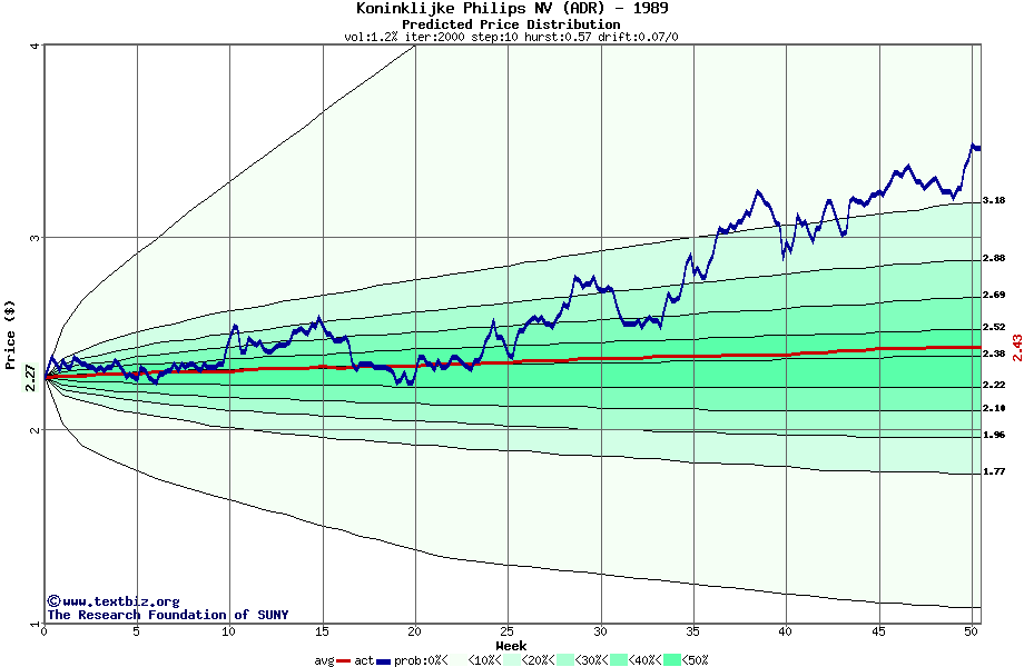 The following graph plots the year-to-date performance of the stock for 1989 compared to the probability calculated by a random walk model.