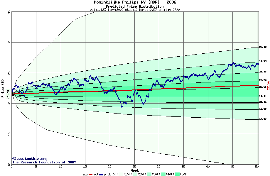 The following graph plots the year-to-date performance of the stock for 2006 compared to the probability calculated by a random walk model.