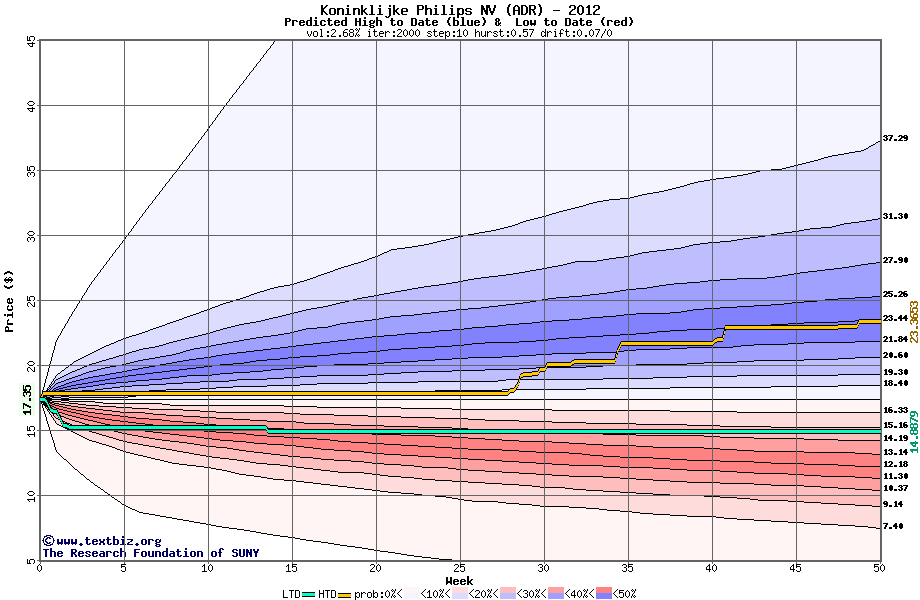 The high to date and low to date prices of the stock plotted against a random walk model for 2012 (what's this?).
