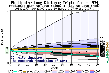 The high to date and low to date prices of the stock plotted against a random walk model for 1974 (what's this?).