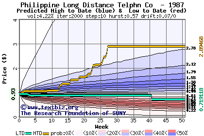 The high to date and low to date prices of the stock plotted against a random walk model for 1987 (what's this?).