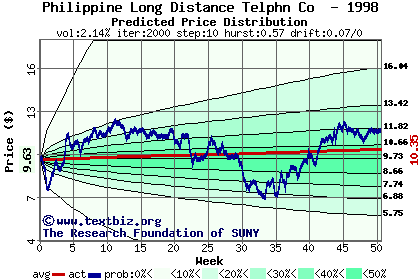The high to date and low to date prices of the stock plotted against a random walk model for 1998 (what's this?).