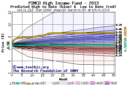 The high to date and low to date prices of the stock plotted against a random walk model for 2013 (what's this?).