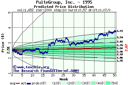 The high to date and low to date prices of the stock plotted against a random walk model for 1995 (what's this?).