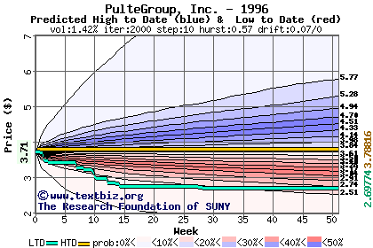 The high to date and low to date prices of the stock plotted against a random walk model for 1996 (what's this?).