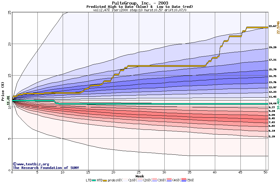 The high to date and low to date prices of the stock plotted against a random walk model for 2003 (what's this?).
