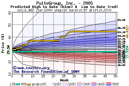 The high to date and low to date prices of the stock plotted against a random walk model for 2005 (what's this?).