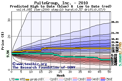 The high to date and low to date prices of the stock plotted against a random walk model for 2010 (what's this?).
