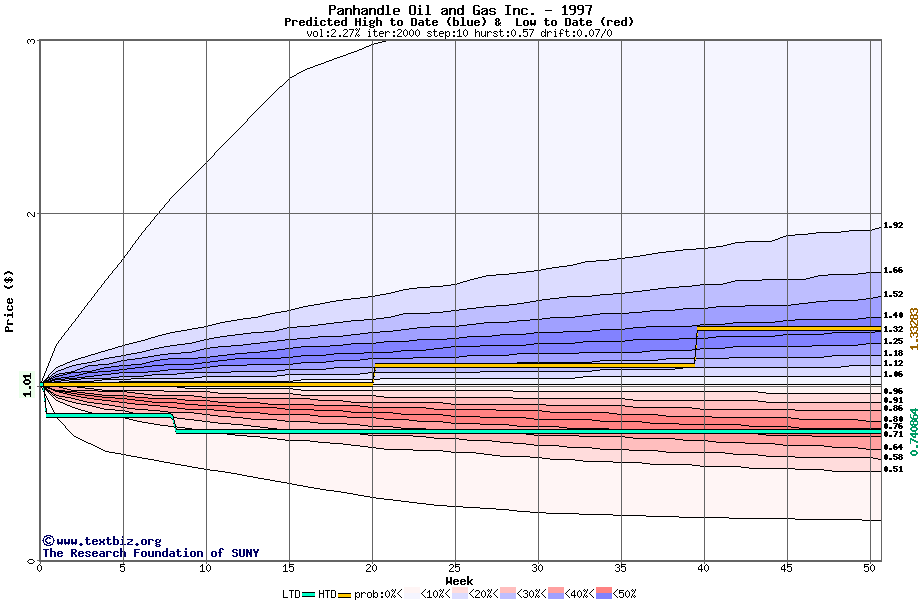 The high to date and low to date prices of the stock plotted against a random walk model for 1997 (what's this?).