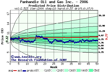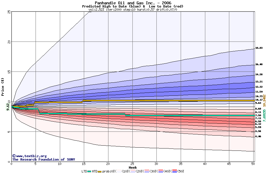 The high to date and low to date prices of the stock plotted against a random walk model for 2006 (what's this?).