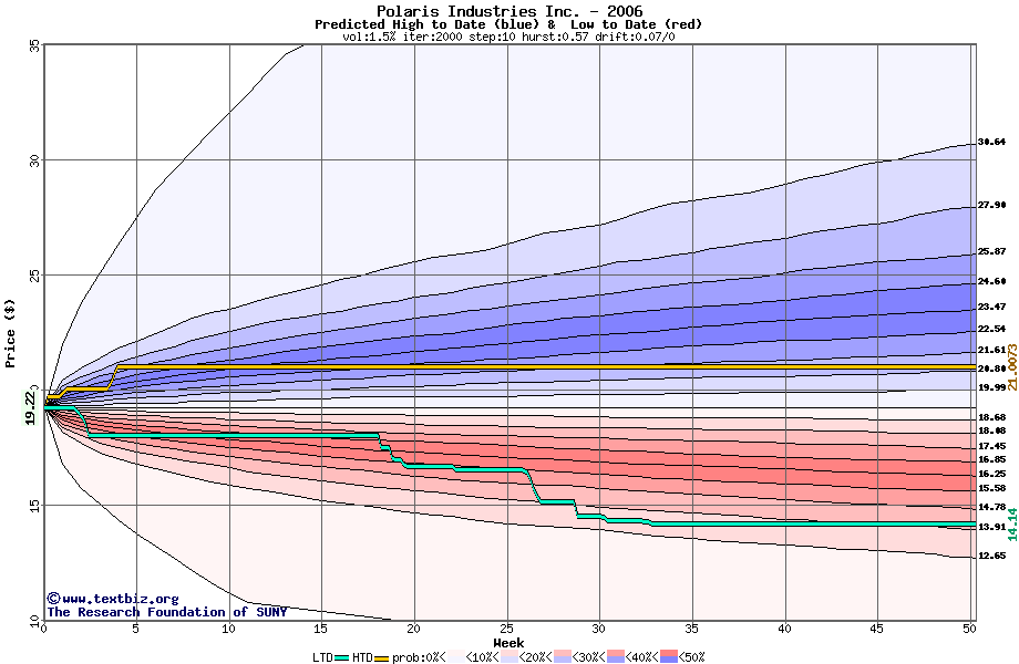 The high to date and low to date prices of the stock plotted against a random walk model for 2006 (what's this?).