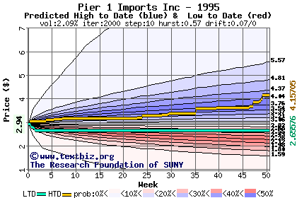 The high to date and low to date prices of the stock plotted against a random walk model for 1995 (what's this?).