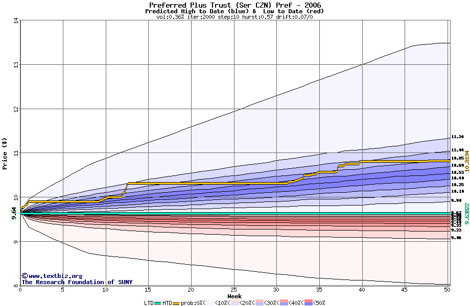 The high to date and low to date prices of the stock plotted against a random walk model for 2006 (what's this?).