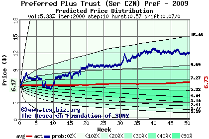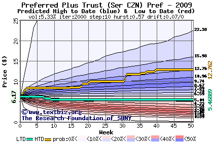 The high to date and low to date prices of the stock plotted against a random walk model for 2009 (what's this?).