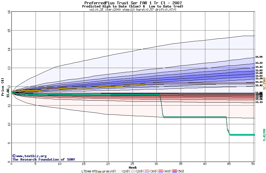 The high to date and low to date prices of the stock plotted against a random walk model for 2007 (what's this?).