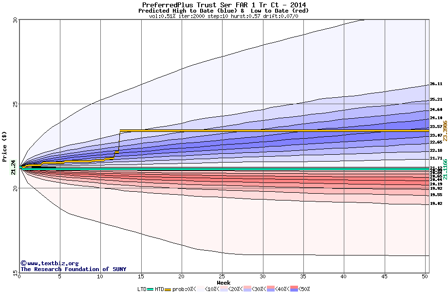 The following graph plots the year-to-date performance of the stock for 2014 compared to the probability calculated by a random walk model.