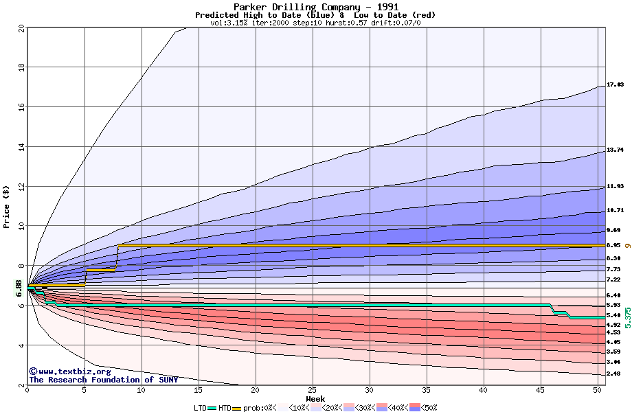 The high to date and low to date prices of the stock plotted against a random walk model for 1991 (what's this?).