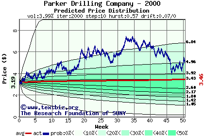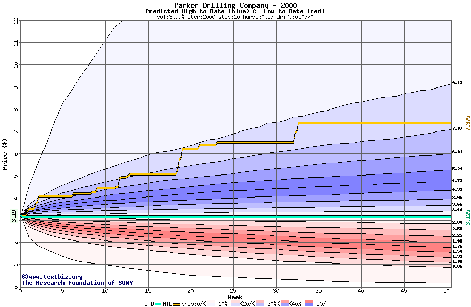 The high to date and low to date prices of the stock plotted against a random walk model for 2000 (what's this?).