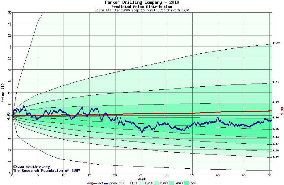 The following graph plots the year-to-date performance of the stock for 2010 compared to the probability calculated by a random walk model.