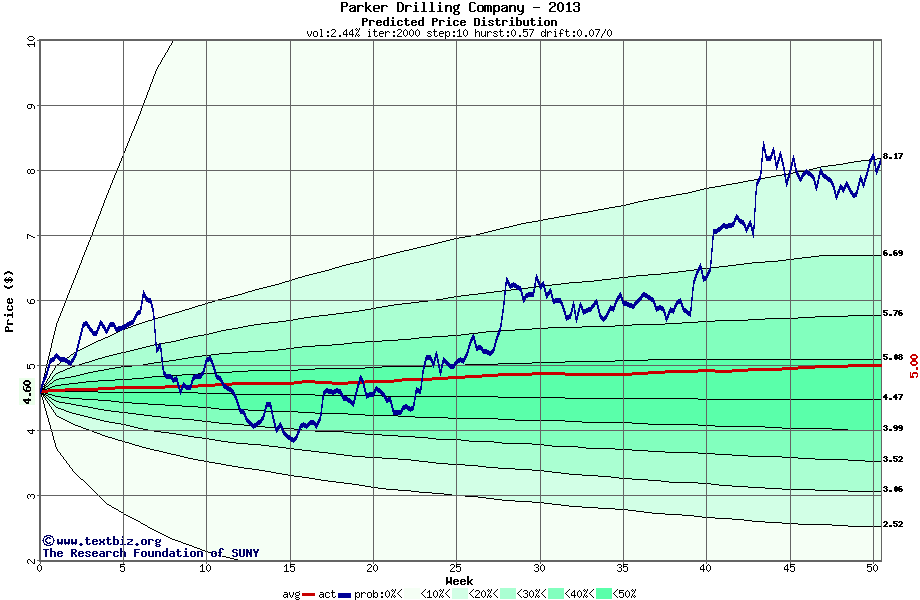 The following graph plots the year-to-date performance of the stock for 2013 compared to the probability calculated by a random walk model.