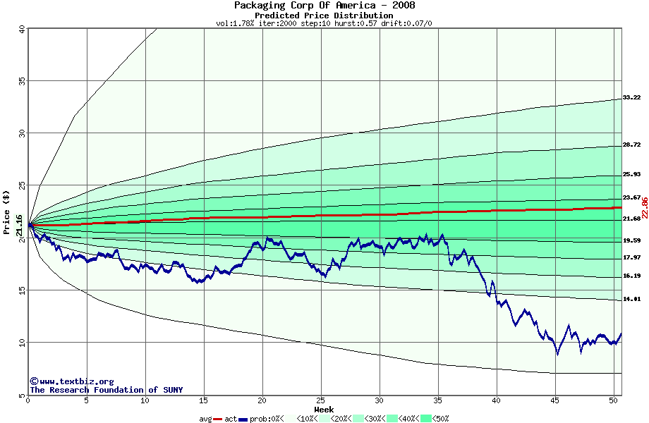 The following graph plots the year-to-date performance of the stock for 2008 compared to the probability calculated by a random walk model.