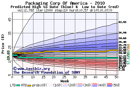 The high to date and low to date prices of the stock plotted against a random walk model for 2010 (what's this?).