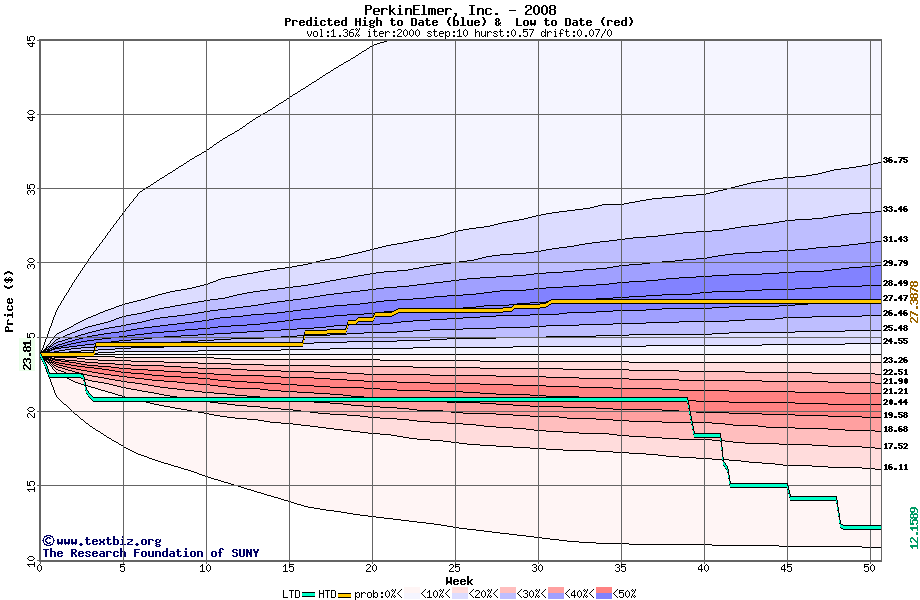 The high to date and low to date prices of the stock plotted against a random walk model for 2008 (what's this?).