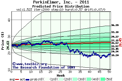 The high to date and low to date prices of the stock plotted against a random walk model for 2011 (what's this?).