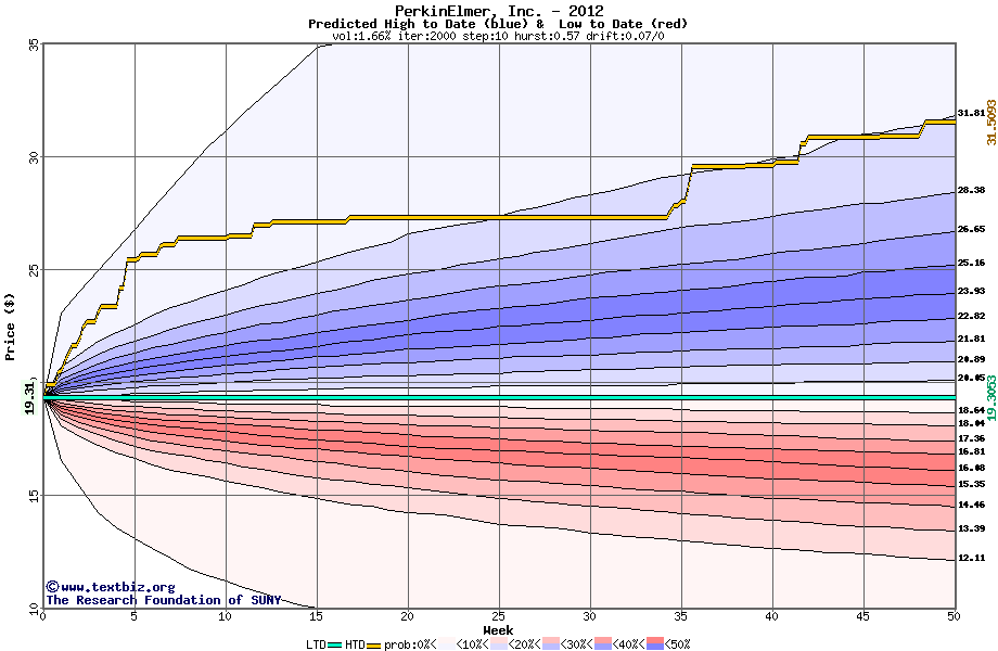The following graph plots the year-to-date performance of the stock for 2012 compared to the probability calculated by a random walk model.