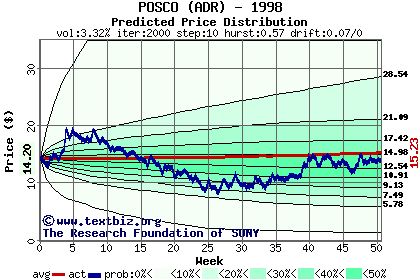The high to date and low to date prices of the stock plotted against a random walk model for 1998 (what's this?).