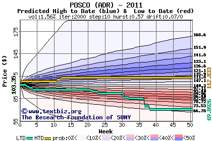 The high to date and low to date prices of the stock plotted against a random walk model for 2011 (what's this?).