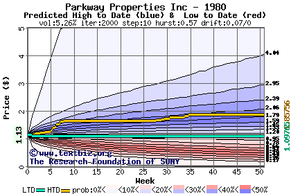 The high to date and low to date prices of the stock plotted against a random walk model for 1980 (what's this?).
