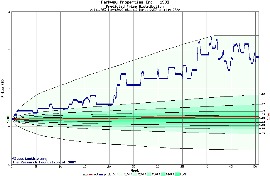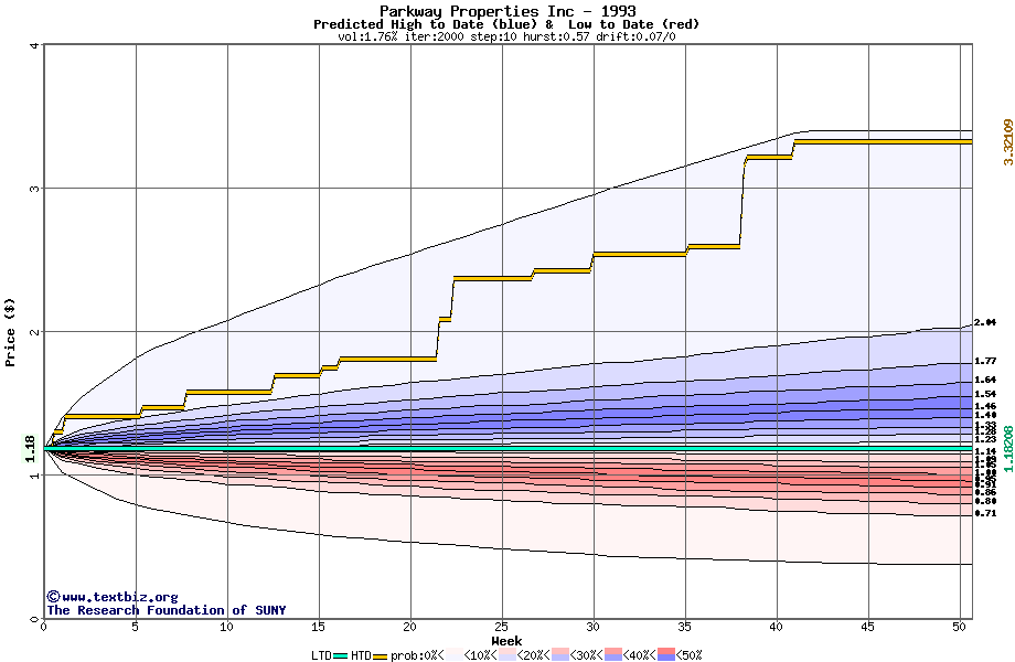 The following graph plots the year-to-date performance of the stock for 1993 compared to the probability calculated by a random walk model.