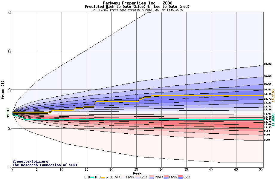 The high to date and low to date prices of the stock plotted against a random walk model for 2000 (what's this?).
