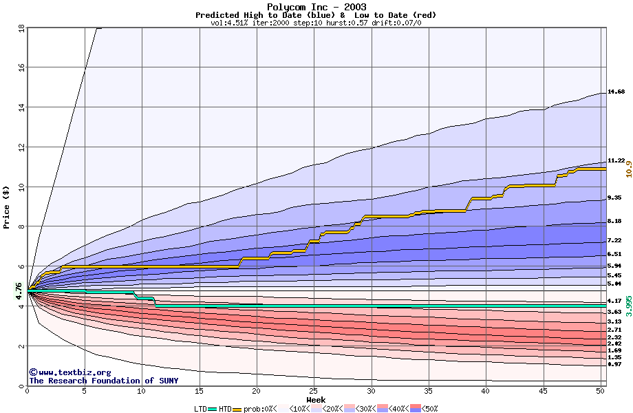 The following graph plots the year-to-date performance of the stock for 2003 compared to the probability calculated by a random walk model.