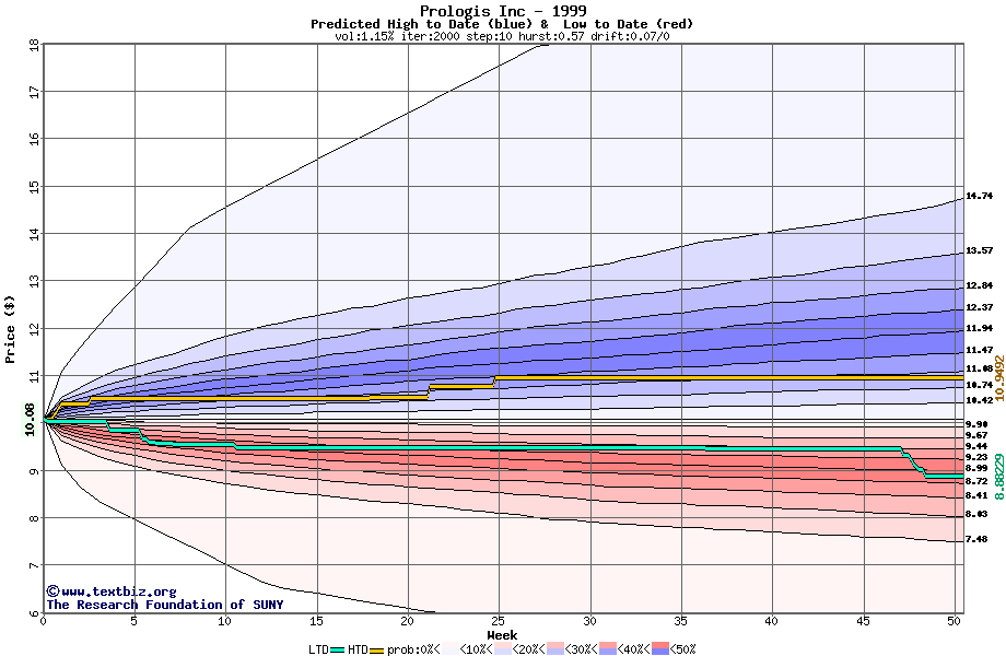 The high to date and low to date prices of the stock plotted against a random walk model for 1999 (what's this?).