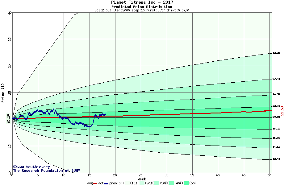 The following graph plots the year-to-date performance of the stock for 2017 compared to the probability calculated by a random walk model.