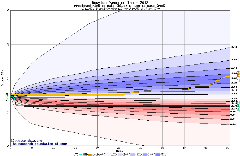 The high to date and low to date prices of the stock plotted against a random walk model for 2013 (what's this?).