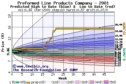 The high to date and low to date prices of the stock plotted against a random walk model for 2001 (what's this?).