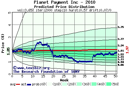 The high to date and low to date prices of the stock plotted against a random walk model for 2010 (what's this?).