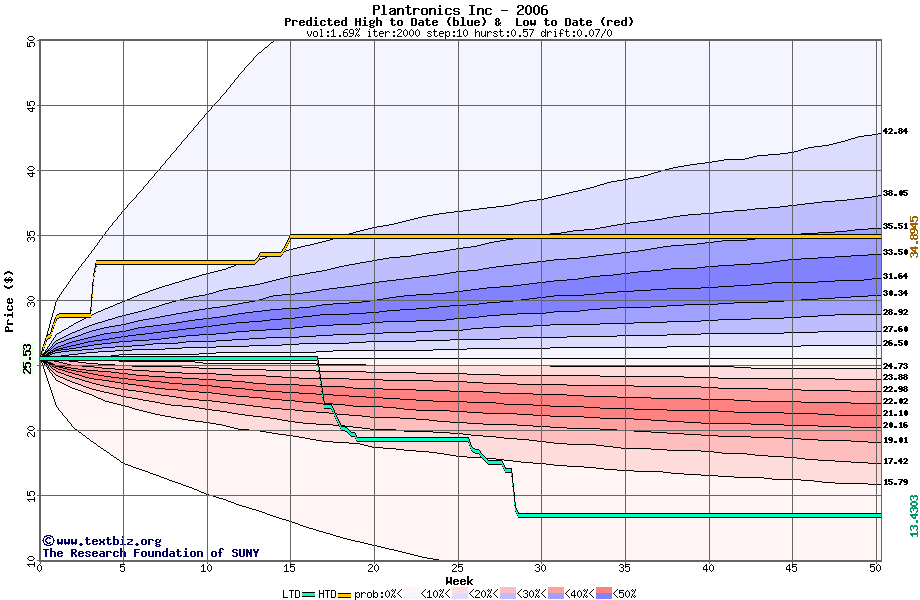 The high to date and low to date prices of the stock plotted against a random walk model for 2006 (what's this?).
