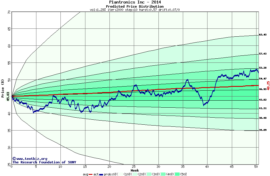 The following graph plots the year-to-date performance of the stock for 2014 compared to the probability calculated by a random walk model.