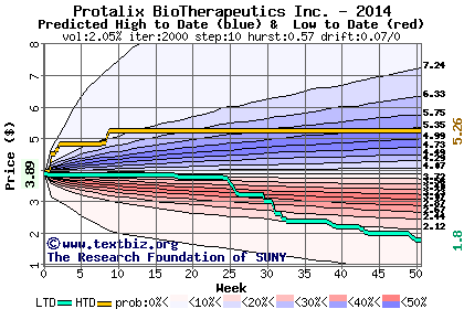 The high to date and low to date prices of the stock plotted against a random walk model for 2014 (what's this?).