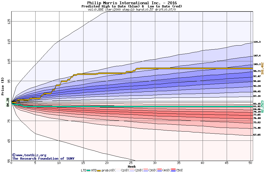 The high to date and low to date prices of the stock plotted against a random walk model for 2016 (what's this?).